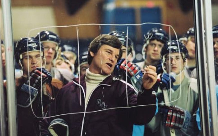 Our protagonist is college hockey coach Herb Brooks, the world’s grumpiest Minnesotan. When we meet him, he is preparing to interview for Team USA’s head coach vacancy. He is drawing a diagram of the world’s simplest hockey play and studying it with a very furrowed brow, so you know he’s a serious person.