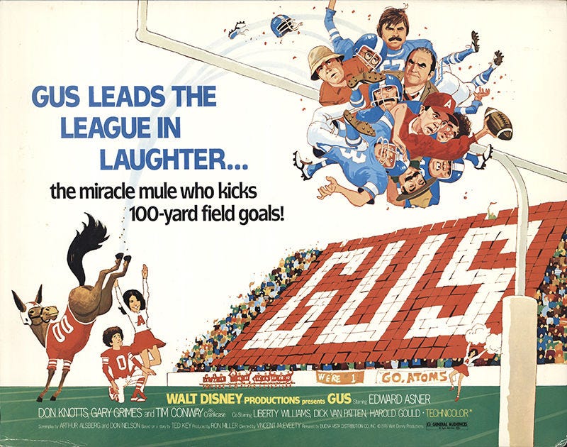Whatever the case, no one had the gumption to roll the dice on repeating the magic of Bonzo Goes to College until Walt Disney Productions gave the world Gus, a slapstick comedy about a struggling NFL team—the California Atoms—who, in their quest for a Super Bowl, sign onto the roster a mule capable of kicking 100-yard field goals and the mule’s Yugoslavian handler, Andy. Andy has an American accent for some reason but is thankfully not characterized as a communist stereotype.