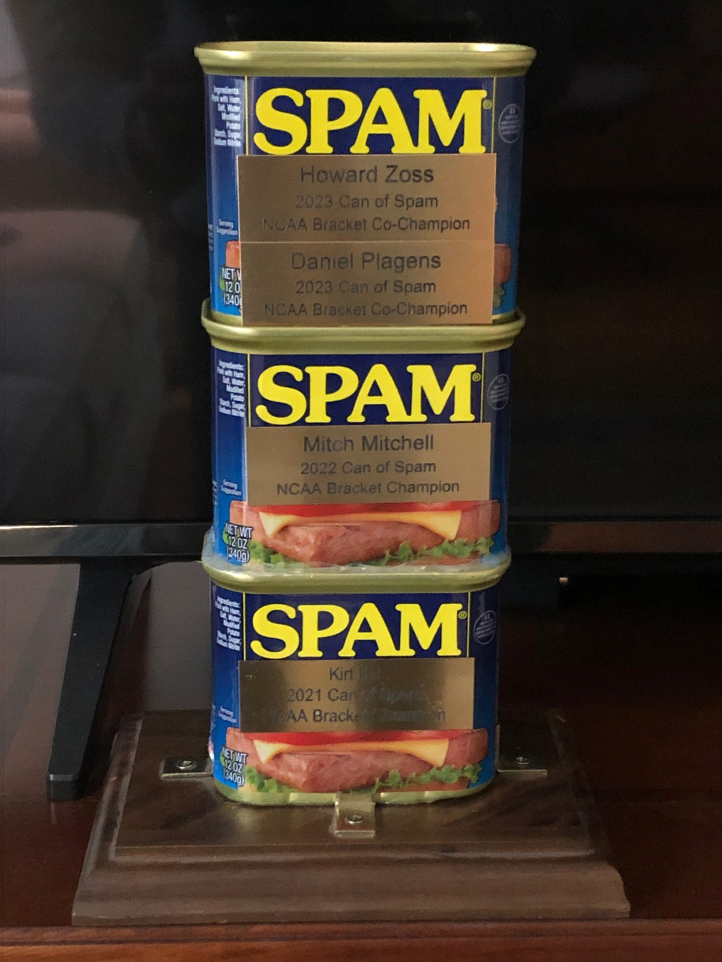 This post is brought to you by THE CAN OF SPAM CHALLENGE.1 The winner of this year’s bracket prediction game will be immortalized on the world famous Can of Spam Trophy, pictured above. We’ll continue to do this until the trophy reaches the height of a standard basketball rim’s (2062, by NASA’s calculations).